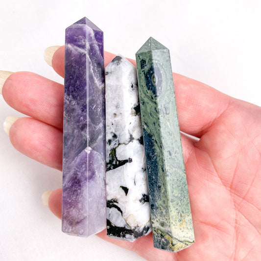 Trio of crystal ring holder towers - Amethyst, Moonstone + Kambaba jasper points bundle