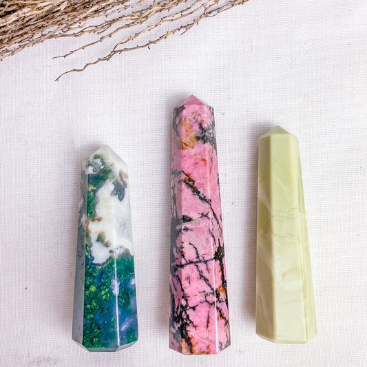 Trio of crystal ring holder towers - Moss agate, Rhodonite + Jade points bundle
