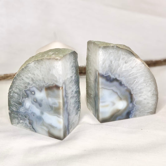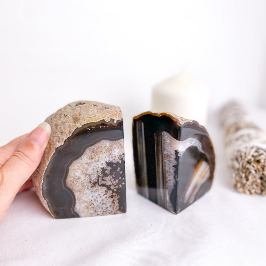 Natural Agate crystal geode stone bookend pair grey brown ivory
