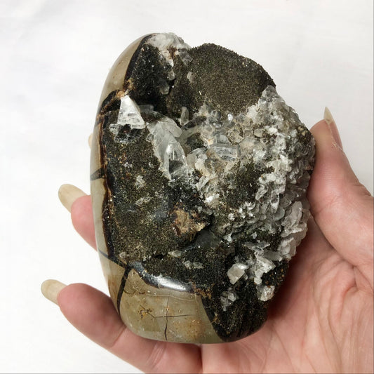 Septarian nodule + Calcite crystal flat base statue M