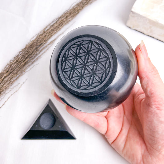 Shungite large crystal sphere flower of life with stand