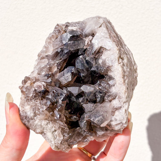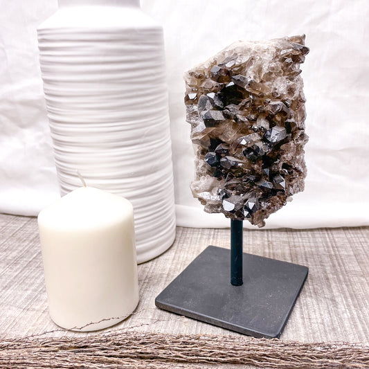 Smoky Quartz is a great grounding stone and will protect you from negative energies. Smokey Quartz can also cleanse and clear bad energy in the room. A Smoky Quartz cluster in your child's bedroom will absorb overactive energy and calm them for sleep. Place a large piece of smoky quartz by technology items like computers and Tvs to lessen the disruptive electric “buzz”.
