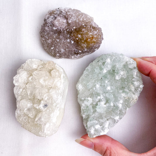 Green heulandite, apophyllite + smoky amethyst crystal cluster trio