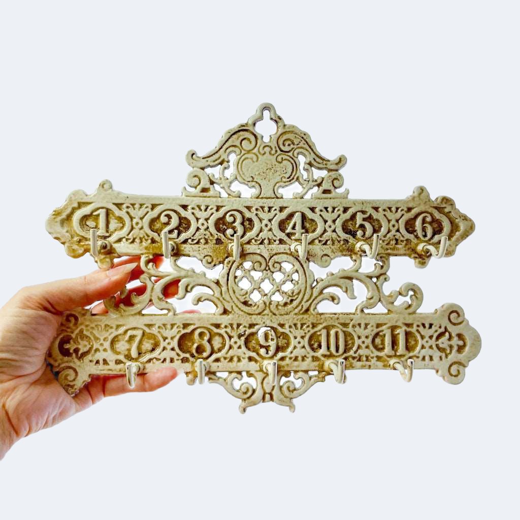 Create a sense of old world boutique charm with this hotel key hook in either bronze or ivory white colour. Ornate design cast in metal. Beautiful piece for your entrance, your office or as your boutique hotel decor!